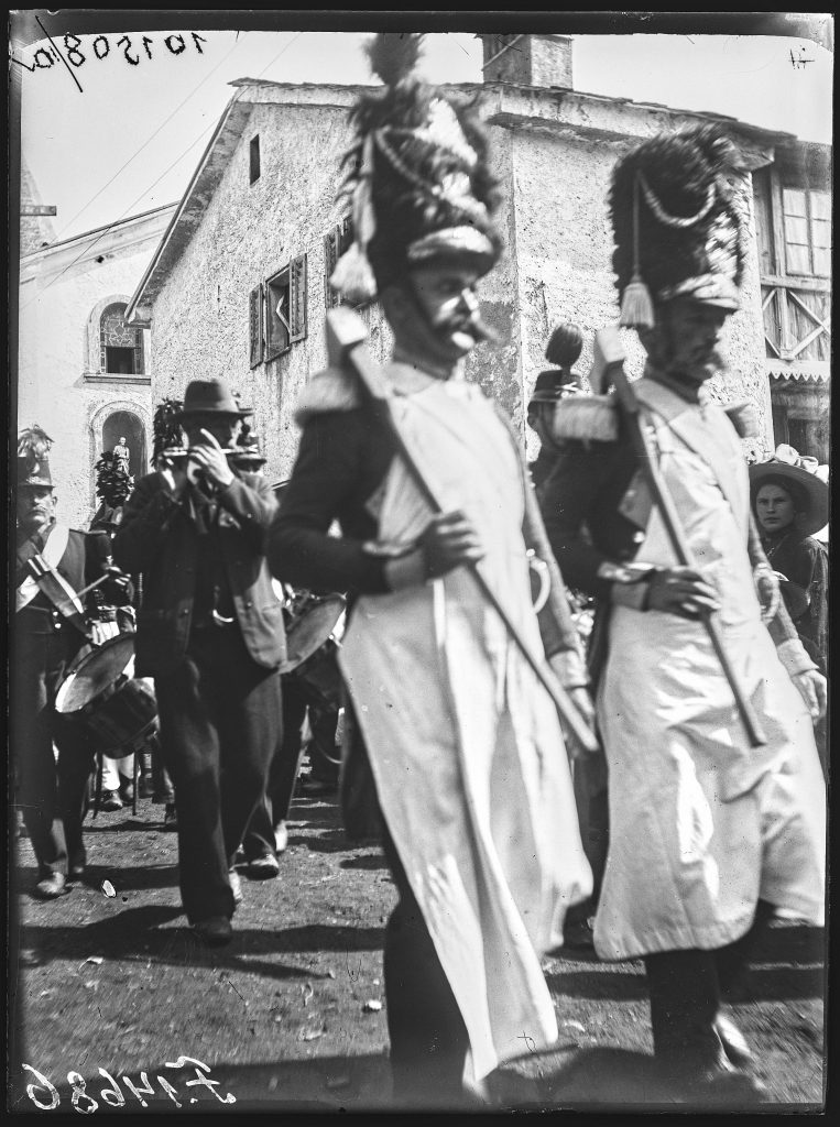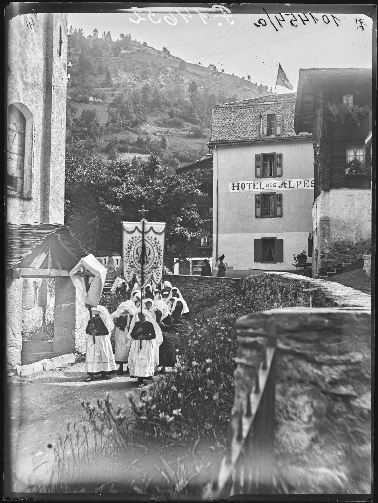 A völgyben élők életét a pásztorkodás mellett a vallási ünnepek határozták meg. Makoldy szerencséjére a néhány hetes tanulmányútja során részt tudott venni Vissoye-ban a templomi körmeneten, és a St. Luc-ban tartott patrónusünnepen. A templomi körmenetet a templomkert falának tövében elhelyezkedve egy távolabbi, fix helyről követte figyelemmel. 3 darab fényképen rögzítette a templom körül zászlókkal vonuló hívek menetét a háttérben a Hotel des Alpes épületével (4. kép). Ezzel szemben a St. Luc-ban lévő zászlószenteléshez kapcsolódó patrónusünnepen (1912. augusztus 3.) a körmenet útvonala mellett közvetlen közelről vette le e napóleonkori katonaruhában menetelőket (5. kép). Erről az eseményről 2 darab felvétel maradt fent az utókor számára.