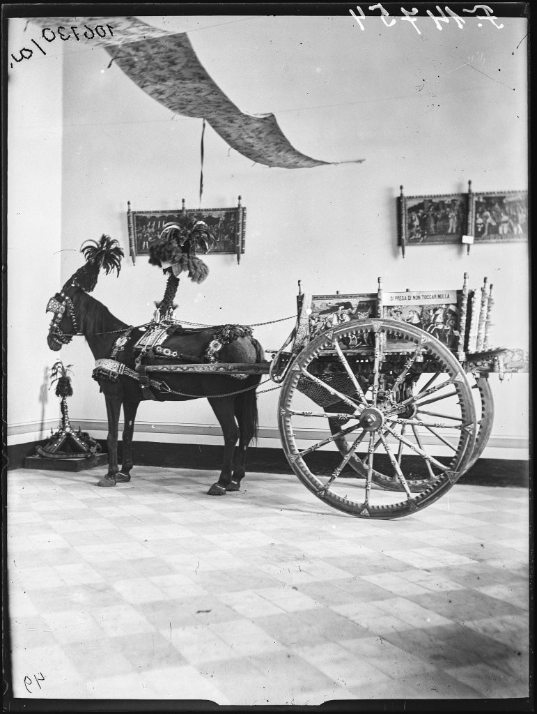 A 20. század elején útikönyvek, képeslapok révén ismert a szicíliai kordé. Makoldy utazása során a palermói múzeumban őrzött változatát is megörökítette, ami népművészeti remekmű, festett történelmi jeleneteivel, faragott elemeivel (9. kép). A kocsi palermói változata sárga alapon vörös díszítésű, ami a városban élők kedvenc színpárosítása volt. Búcsúk, egyházi ünnepek, nagyvásárok alkalmával használták, és az elé befogott lóra, szamárra is díszesebb szerszámokat adtak. A kordé kevésbé díszített változatát teherszállításra használták a mindennapokban. Bort, olajat, szenet szállítottak vele. (19. kép)
